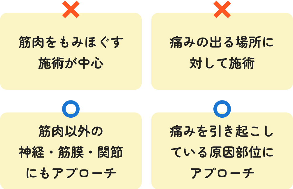 当院では、一般的な整体のように筋肉を強く押したり、骨をボキボキ鳴らしたりはしません。関節・筋肉・神経にやさしく働きかけ、痛みの原因を改善に導きます。